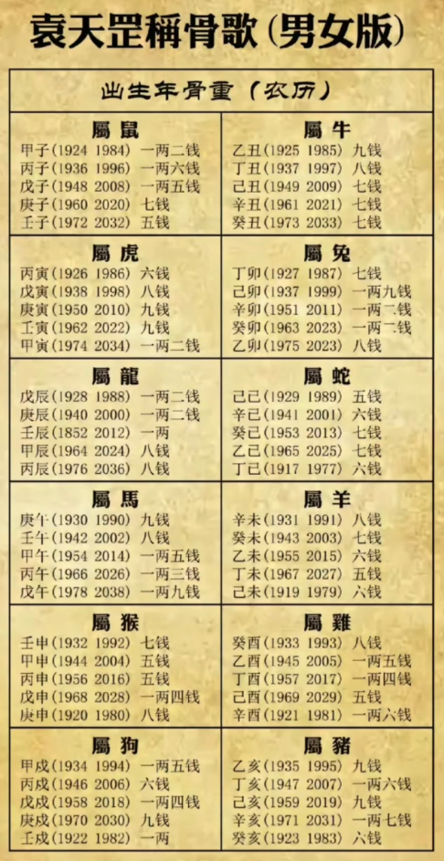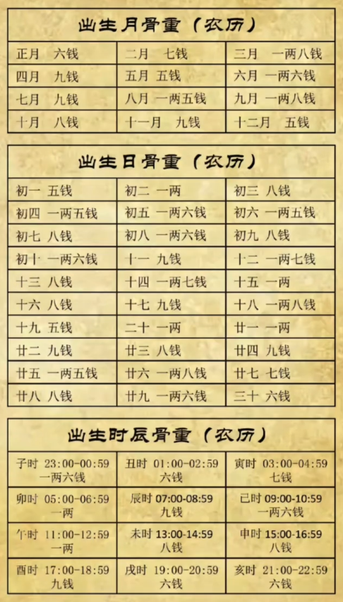 袁天罡称骨算法是根据个人八字(即出生年月日和时辰),分别在后面所附内容中查出出生年的重量、出生月的重量、出生日的重量以及出生时辰的重量,将四个重量相加所得即为八字重量。