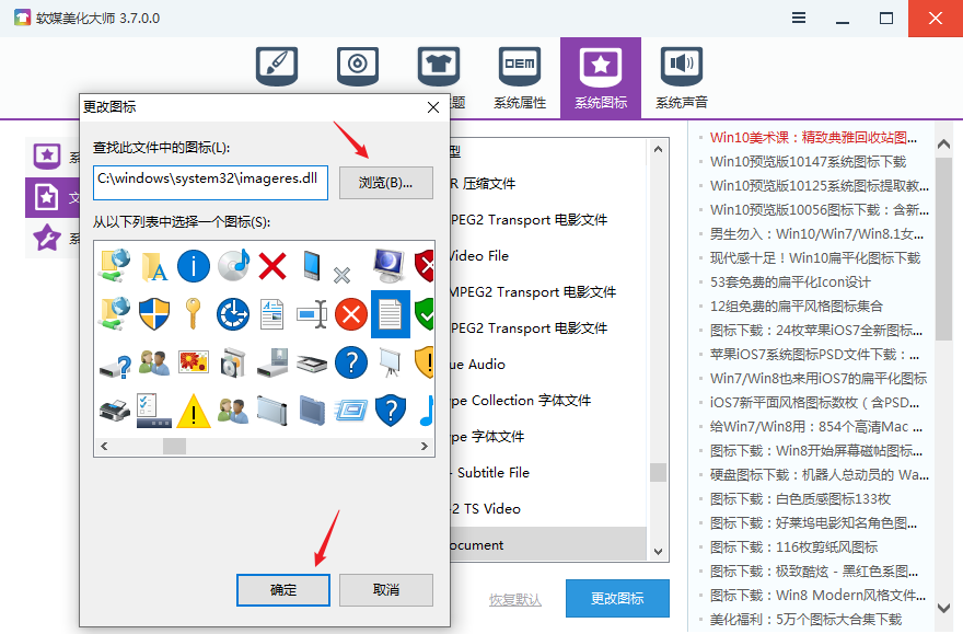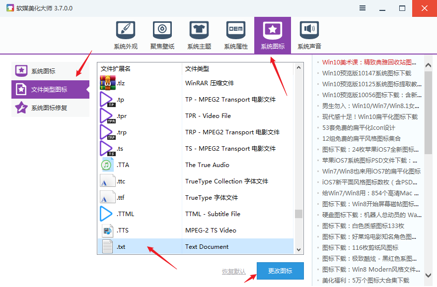 一、软媒魔方 - 美化大师:系统图标 -> 文件类型图标 -> .txt(选择你要修改的文件类型)-> 更改图标 -> 浏览(选择图标文件.ico,也可以选择带有图标文件的.exe 程序或.dll 文件)-> 确定。
