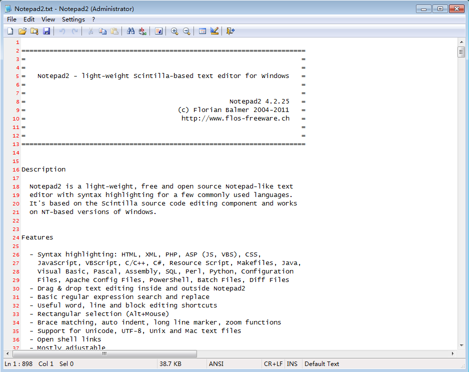 软件具备显示行号、无限书签定位及自定义语法高亮功能,支持更改背景颜色和 HTML、XML、CSS、JavaScript 等20余种脚本文件。通过ALT+鼠标实现任意文本块操作,支持 ANSI/Unicode/UTF-8 编码互换与正则表达式搜索替换。其特色包含行列功能实现的区块模式编辑、括号配对高亮显示及 ESC 键快速最小化至系统托盘。2020年9月发布的 V4.2.25.998 中文版优化了本地化支持,相较于 Notepad ,该软件在文本编码自动识别方面较弱,但保持了单文件轻量化特性。