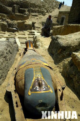 这是在埃及首都开罗南部展示的一具新近发现的色彩鲜明的木乃伊(摄于5月3日)。当日,埃及最高文物委员会秘书长哈瓦斯宣布,一支埃及考古队两周前在首都开罗南部的萨卡拉金字塔区发现一具保存完好的2300多年前的木乃伊,制作时间大约在公元前380年至公元前343年间,其身份尚未确定。