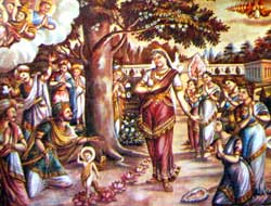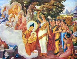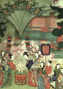 摩耶王后在回娘家天臂城分娩的途中,经过迦毗罗卫城和天臂城交界处的兰毗尼花园时,就下轿到花园中休息,当摩耶王后走到一棵葱茏茂盛的无忧树下,伸手去抚树枝时,惊动了胎气,就在树下生下了太子。 太子诞生的时间是公元前565年,中国农历四月初八,佛教将这一天定为“佛诞节”,也称“浴佛节”。 图中抱着小太子的是传说中的天王,天王身后是诸梵神,手扶树枝站立的是摩耶王后。佛经上说,太子是从摩耶王后的右肋出生的,摩耶王后夜梦中的白象也是从右肋进入体内而怀孕的。