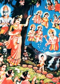 游园后,摩耶王后在一棵无忧树的绿荫下休息,她见这无忧树枝叶茂盛,柔软低垂,树上花果鲜丽,芬芳可爱,便举手攀摘花果,于是王子就生了下来。 佛经说,王子刚生下就能说话,无人扶持即能行走,他身上发出光明,目光注射四方,举足行了七步,每步地上都出现一朵莲花,一时间香风四散,花雨缤纷,仙乐和奏,诸天齐声赞颂,地上也自然涌出冷暖二泉,香冽清净。