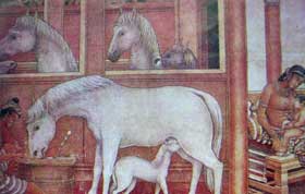 佛经上说,摩耶王后生下太子之后,迦毗罗卫全国不断出现吉祥的事情,浑浊的江河水变得清澈了,五谷丰登,花木繁茂,人与人之间也变得和睦了,与太子同日降生的孩子,母子都十分健康,产生的牛马也都十分健康,连一根杂色鬃毛都没有。 图中是与太子同时降生的,没有一根杂色鬃毛的白马,右侧是与太子同时诞生的普通百姓家的孩子,母子都十分健康。