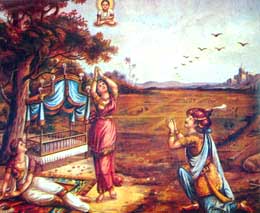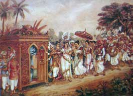 净饭王听到摩耶王后在兰毗尼花园生下了太子,高兴万分,立即带领众多的宫女、侍臣、车马和特制的华丽的大轿,赶到兰毗尼花园,将王后和王子接回皇宫。 图为摩耶王后抱太子从兰毗尼花园返回迦毗罗卫城。