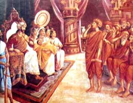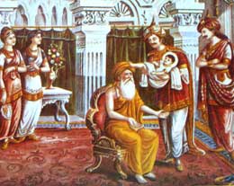 悉达多太子出生不久,预言家阿斯陀仙人来到王宫给太子占相,看到太子先是惊喜,转而又悲伤地流下了泪水,净饭王问他为何又喜又悲,阿斯陀回答:“太子的相好庄严,人间找不出第二人来,如果继承王位,一定是位‘转轮王’(能统一四方天下的君主),因此我为国王高兴,但据我观察,太子必定要出家修道,并能得到最高成就,成为人间至尊的导师,拯救世人离苦海,可惜我已经老了,听不到太子的教诲了,所以我为自己悲哀。” 净饭王听了,也是又喜又忧,他希望自己的儿子成为统一天下的转轮王,从此千方百计防止太子出家修道。 图中是阿斯陀来到王宫,为悉达多太子占相。