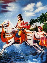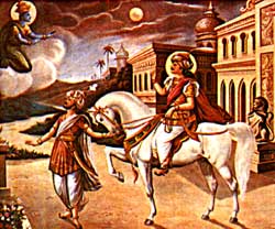 悉达多太子又来到马厩,唤醒了名叫车匿的马夫,叫他牵出一匹名叫犍陟的白色骏马,备上马鞍,太子跨上马背,由车匿伴随。在整个皇宫里的人都在梦乡的时候,太子跃马出了京城的北门,在白茫茫的月色中,朝山林奔驰而去。 佛经上说,悉达多离王宫出家的当晚,有天神来为他引路,图左上空出现的就是传说中的引路天神。