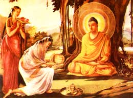 悉达多太子结束苦行后,先到尼连禅河中洗去了他身上六年的积垢,随后接受了牧女(一名难陀,一名波罗)供养的牛奶。太子接受了供养,发愿说:“今食饮食,得充气力,以保留智慧年寿,为度众生。”从此他每日接受牧女供养的牛乳和乳糜,一月之后恢复了昔日的壮健。 随从他的五个人见他这样做,以为他放弃了信心和努力,便离开了他,前往波罗奈城的鹿野苑,去继续他们的苦行。 图中牧女向释迦牟尼奉献牛奶。