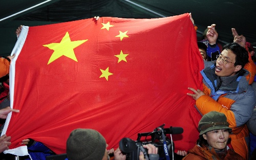 工作人员在珠峰大本营新闻中心里展开国旗庆祝火炬登顶成功