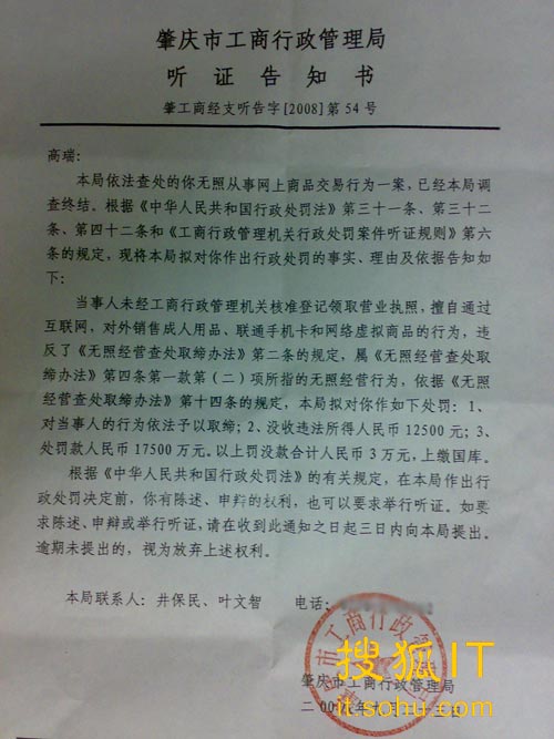 高瑞向搜狐IT出示了一份由广东肇庆市工商行政管理局向其下达的听证告知书。