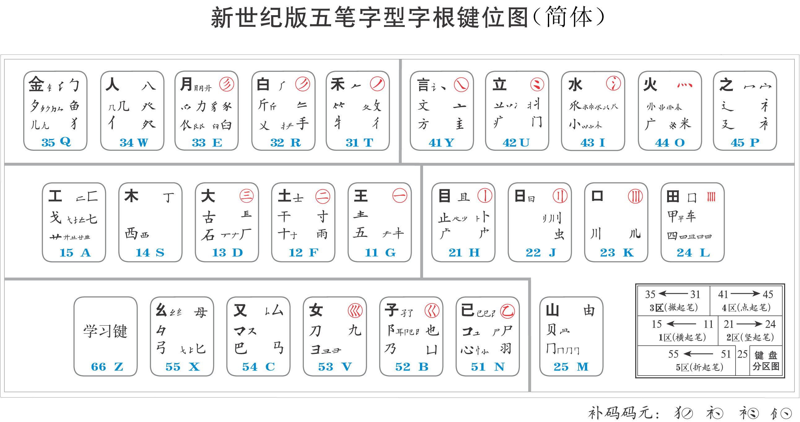 为保持技术的连续性,第三代五笔字型(新世纪版)的25个“键名”没有变动。新设计的字根体系更加符合分区划位规律,更加科学易记而实用,按规范笔顺写汉字的人,取码输入将得心应手。现将新世纪版的《字根助记歌》公布于下: