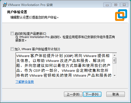 建议取消「启动时检查产品更新」(有新版本需要更新时手动更新即可)、「加入 VMware 客户体验提升计划」,单击[下一步]继续;