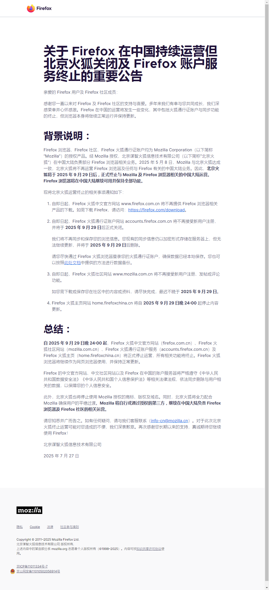 Firefox 浏览器、Firefox 社区、Firefox 火狐通行证账户均为 Mozilla Corporation(以下简称“Mozilla”)的授权产品。经 Mozilla 授权,北京谋智火狐信息技术有限公司(以下简称“北京火狐”)在中国大陆负责部分 Firefox 浏览器相关业务。2025 年 5 月 8 日,Mozilla 与北京火狐达成一致,北京火狐将不再运营 Firefox 浏览器及任何与 Firefox 有关的中国大陆业务。因此,北京火狐将于 2025 年 9 月 29 日后,正式终止与 Mozilla 及 Firefox 浏览器相关的中国大陆运营。Firefox 浏览器将在中国大陆继续可用并保持全部功能。