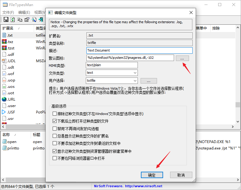 三、NirSoft FileTypesMan:.txt(选择你要修改的文件类型)-> 编辑所选文件类型 -> 浏览(选择图标文件.ico,也可以选择带有图标文件的.exe 程序或.dll 文件)-> 确定。
