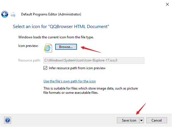 二、Default Programs Editor:File Type Settings(文件类型设置)-> Icon(图标)-> 输入 html(搜索一下想要修改的文件类型)-> 选择文件类型 -> Browse(选择图标文件)-> Save Icon(保存图标)。