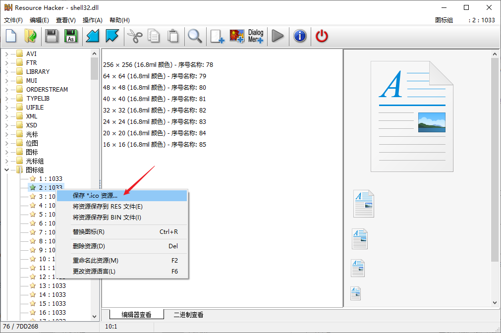 提取保存的图标文件.ico,可能包含多种不同尺寸的图标。提取当前运行 Windows 系统的 shell32.dll 文件的图标时,先把文件复制到其他位置,再打开提取。