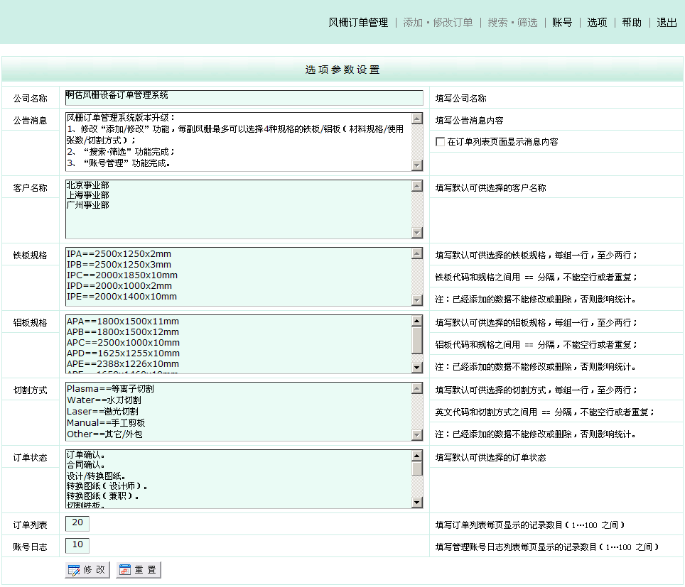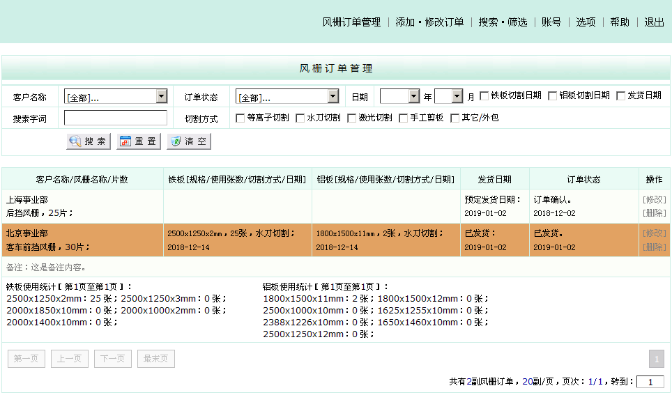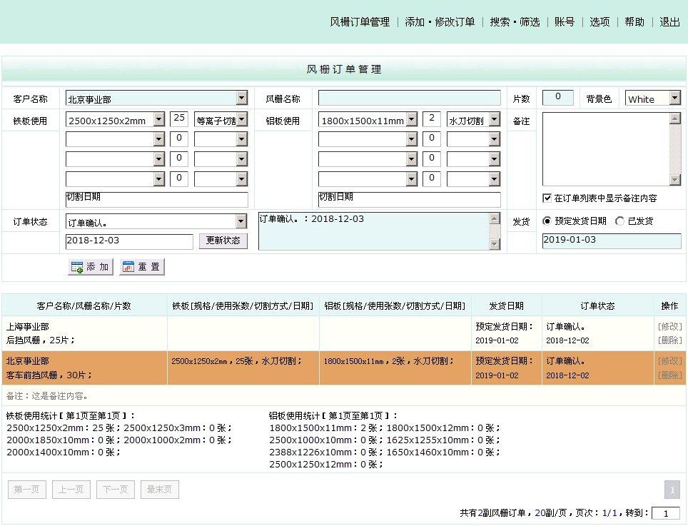 一款风栅订单管理系统,设计这套系统,只为方便公司内部使用。可以添加多个管理账号,同时多人登录操作。添加/修改订单,添加/统计材料的使用记录(默认可以添加2种材料的使用和统计,每种材料可以添加使用4种不同的规格、使用张数,切割方式),制作过程中,随时更改订单状态。搜索/筛选订单。在订单列表,自动统计2种不同规格的材料的使用张数。