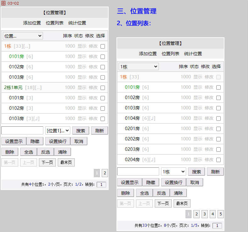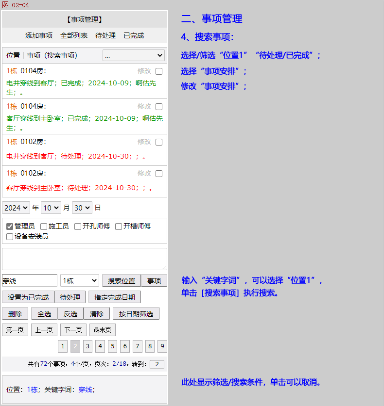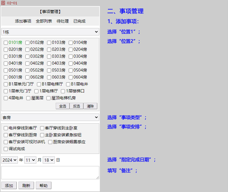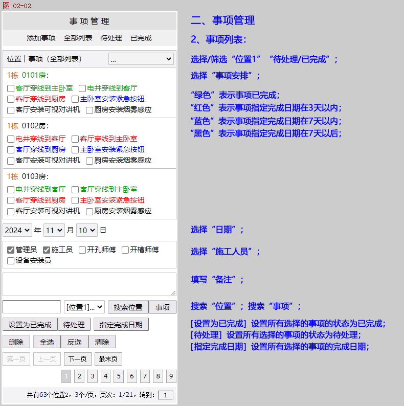 位置/事项管理:可以提前把需要施工的位置和事项安排全部添加到此系统(位置和事项安排都支持批量添加),例如:位置:1栋1单元(添加为位置1)0101套房(添加为位置2),事项安排:套房客厅穿线到电井,客厅安装可视对讲机,调试可视对讲机等等(添加为事项)。某一个/一组施工人员处理完成,登录系统设置为已完成。整个项目的全部事项安排,管理人员都能方便查看/搜索哪些事项待处理,哪些事项已完成,已完成事项都由哪些施工人员处理。
