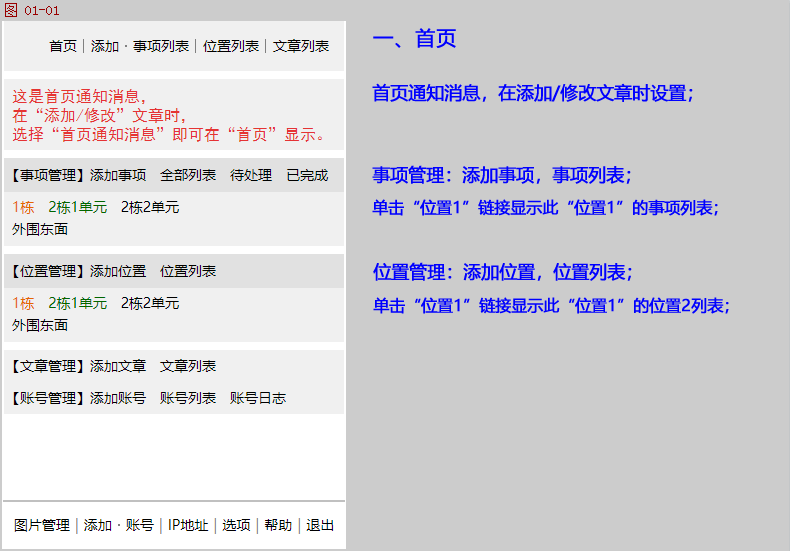 编写网站系统的初衷:之前在新小区做智能化项目,主要就是安装监控、门禁、可视对讲、车库道闸等。一个新小区有十几栋楼,每栋有几百套套房,还有地下室车库。所有这些位置都需要拉线、布线、安装设备箱、安装设备、调试设备等。需要处理大量的事项,如果这些事项都记在脑袋里,大概三五天就忘记了。如果记在笔记本,随身带着笔记本不方便,查找起来也不方便。如果记在电脑里,查找起来是方便了,但随身带着电脑也不方便。所以才想起编写一套网站系统,只要带着手机,随时随地都可以登录网站系统添加事项,查看/搜索哪些事项已经完成了,哪些事项需要提前处理,哪些事项由哪些施工人员完成的。施工过程中碰到的一些问题,也可以随时记录在本系统、上传图片,也方便以后维护时查看/搜索相关事项。