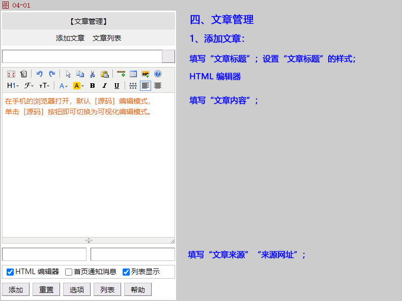 文章/资料管理:把项目相关的文章/资料添加到此系统,方便施工人员浏览/阅读。也可以设置其中一篇文章为“首页通知消息”,施工人员登录到此系统即可看到最新通知消息。