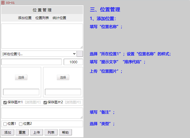 图片管理:浏览/删除上传的位置/事项/文章图片,在〖选项〗页面可以设置上传的文件夹、允许上传的图片类型、大小。