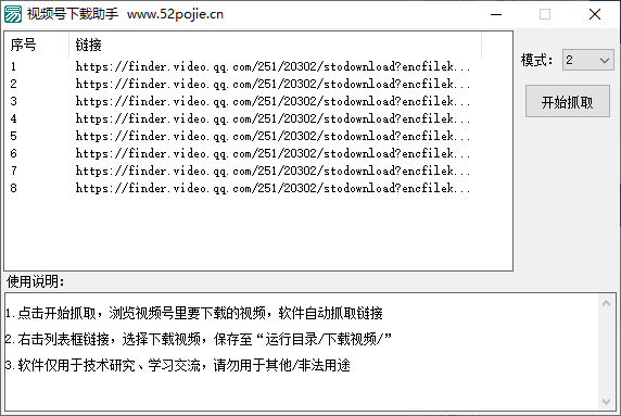使用很简单,只需要在后台打开视频号网页,然后打开软件,点击开始抓取,就会自动抓取正在播放和列表中的视频链接,最后一步选择你要下载的视频,右键单击即可。