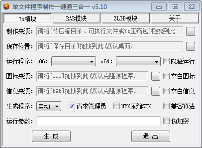 7、生成程序:x86/x64:生成单文件程序位宽(和工具本身位宽无关)(仅限 7z 模块和 RAR 模块);