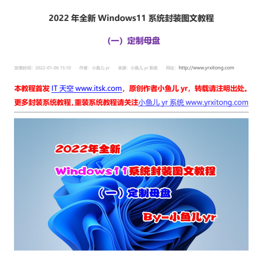 小鱼儿yr 2022 年全新 Windows 11 系统封装图文教程,一共六份 PDF 文档:一、定制母盘,二、准备系统封装环境,三、母盘安装及优化清理,四、常用软件安装及设置,五、封装前再次优化清理,六、使用 ES5S 进行封装。