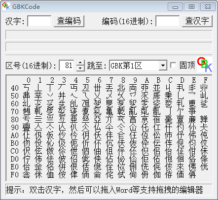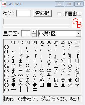 查询汉字的区位码,或按分组、按区显示汉字。开始是为了对比 Java Script 对中文字符串的支持,后来发现还有其它用途:可以 Copy/Paste 包括日语、俄语、希腊字母、拼音等在内的特殊字符,可以从汉字查读音,等等……。后来为了输入的方便,又增加了 Drag & Drop 功能:双击选中某个字符,按住鼠标可以拖动到 Word、IE 等软件的输入窗口。拖动时如果嫌窗口来回倒换麻烦,可以选中“顶层窗口”选项,让窗口固定在所有窗口的上方。