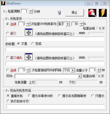 A:ShutDown 只能运行在中文、英文 Windows 2000、XP 下,不支持 Windows 95/98/ME。其它语种的 Windows 2000/XP 大概只能用窗口标题条做关机条件,不能用 CPU 利用率。 |