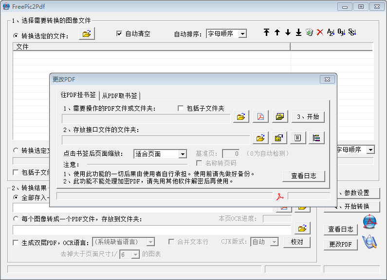 7、可以选择需要转换的文件,也可以指定需要转换的文件夹;可以指定文件排序方式(按字母顺序、按末尾数字顺序、按超星顺序);可以将所有图像文件合并到一个 PDF 文件,也可以每个图像文件分别转换成一个 PDF 文件。