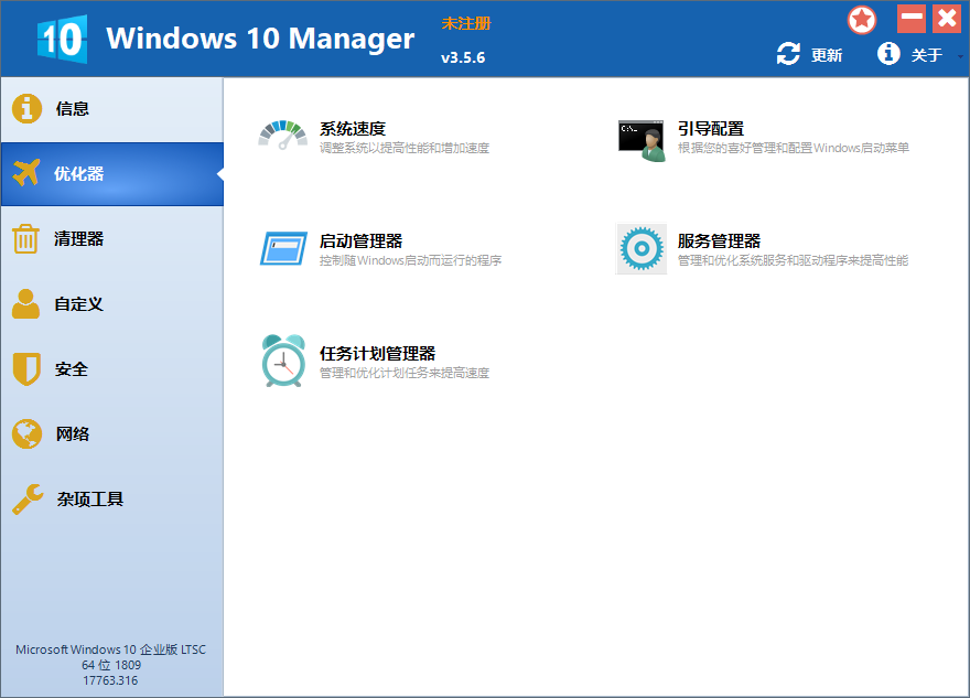 Windows 10 Manager 是专门用于微软 Windows 10 的集所有功能于一身的实用工具,它包括了40多个不同的实用程序来优化,调整,清理,加快和修复您的 Windows 10,可以让你的系统执行速度更快,消除系统故障,提高稳定性和安全性,个性化您的 Windows 10,它能满足您的所有期望。