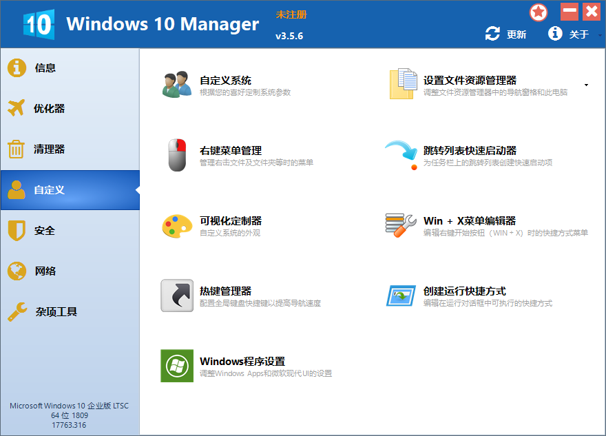 调整资源管理器的外观,桌面,开始菜单,任务栏和通知区域来自定义您的系统;管理被固定项目和固定任何文件或文件夹到任务栏和开始;在任务栏上创建快速启动的跳转列表项;调整 Windows 10 的启动菜单;鼠标右键单击的编辑上下文菜单;轻松编辑当鼠标右键点击桌面左下角或 Win+ X 键盘快捷键显示的 Win + X 菜单;创建快速执行在运行对话框中的快捷方式。可视化定制可以更改系统和文件类型图标,自动改变锁屏图像。