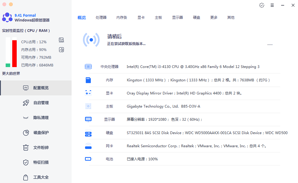 硬件概览:CPU 信息,内存信息,磁盘信息,声卡网卡信息应有尽有。