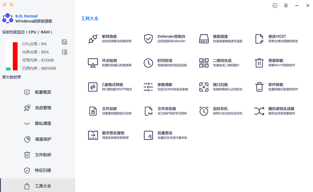 一款功使用便捷的 Windows 系统管理软件。Windows 超级管理器官方版提供全面的系统检测功能,Windows 超级管理器能高效地帮助用户查看和了解计算机参数配置,软件并且附带多个实用的工具功能,软件的硬盘测速功能可以在数秒钟相对准确地测试出用户硬盘的读写速度。