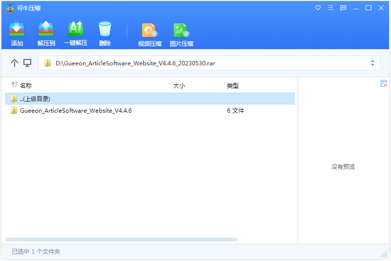 主界面解压:打开可牛压缩,选中需要解压的文件,点击工具栏【一键解压】,即可完成文件解压。
