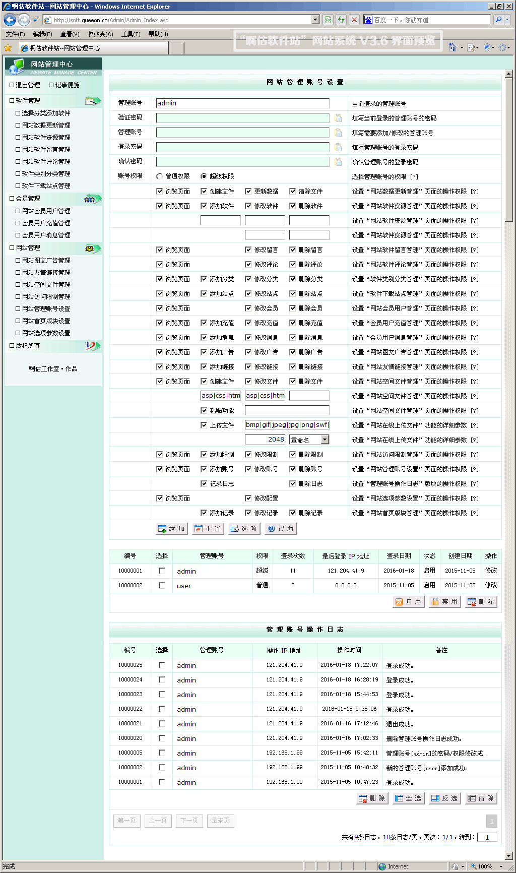 •网站管理账号设置:网站管理账号,添加/修改(密码/权限)/删除,不同的管理账号对后台页面(功能)的浏览、添加、修改、删除权限可以分别设置(包括设置允许添加/修改的软件类别/分类的编号,允许在线上传的文件类型、文件大小等),查看/删除管理账号操作日志(登录成功、登录密码/验证码错误、修改管理账号密码/权限、删除操作日志都会记录)。