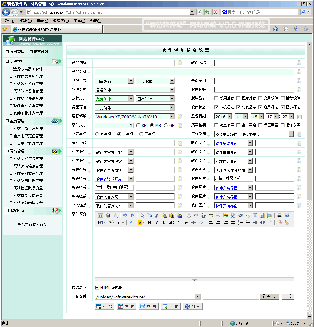 •网站软件资源管理:添加/修改软件/下载链接,批量修改软件名称的字体/字号/颜色、软件类别/分类、下载站点、软件状态、版块显示、会员编号、整理日期、清除下载次数、删除软件,添加软件时在同一类别及分类下会检测重复性。对于不同的管理账号可以分别设置允许添加的软件类别/分类,可以设置是否允许修改其他的管理账号添加的软件。