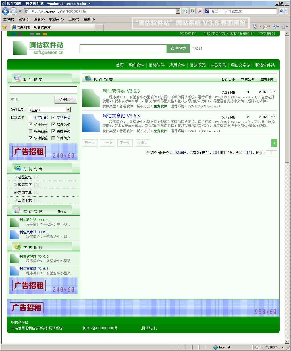 原“浪人下载”网站系统,自新版 V3.6 开始改名为“啊估软件站”网站系统。“啊估软件站 V3.6”是在“浪人下载 V3.2.4”的基础上进行修改和设计的。“啊估文章站”和“啊估软件站”是姊妹篇作品,有一部分文件/图片可以通用。