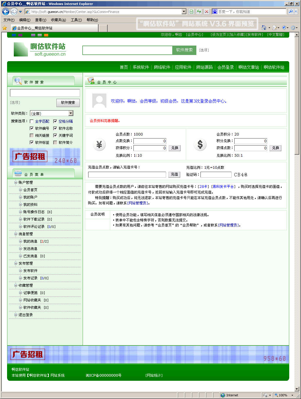 •网站会员用户管理:批量修改会员等级(初级/中级/高级),会员权限(上传会员头像、软件评论、消息功能、发布软件、收藏功能),会员点数,会员积分,账号状态,删除会员账号。(会员用户登录会员中心即可修改资料、注销账号、充值会员点数、兑换会员点数/积分,查看登录日志、下载日志。会员点数、会员积分达到设定要求,也可以自助升级会员等级。)