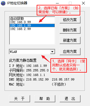 1、[新建方案]根据你的需要,添加不同网段的IP地址、子网掩码、网关、DNS;