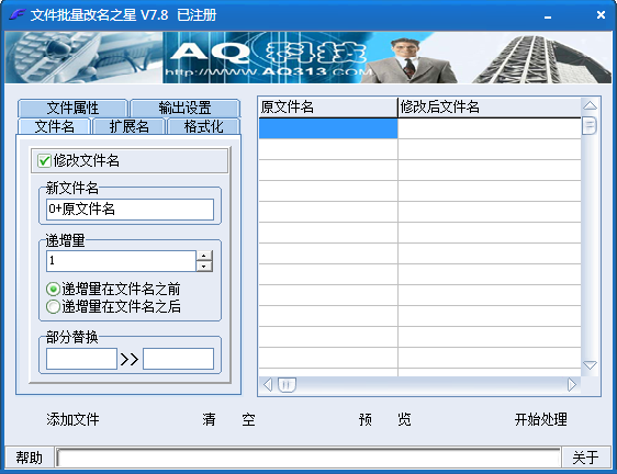 一款功能强大的文件改名工具。可以把所有的文件快速方便的重命名;支持所有格式;支持改名预览;支持文件属性更改;支持文件时间修改;支持多文件夹同时处理;支持音乐、图像改名前预览等功能。