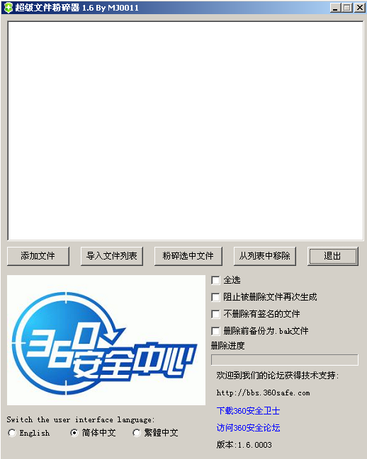 360 安全卫士 - 文件粉碎器,文件粉碎机是一款工具软件,可以粉碎一切顽固型文件。将需要粉碎的文件拖拽进文件粉碎机,即可完全粉碎!被粉碎的文件不可恢复,需要慎重操作。