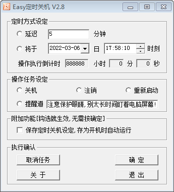 一款运行于 Windows 9x/2000/XP/2003/Vista 系统的定时关机得力助手。具有延迟一定时间或在设定的时间执行关机、重新启动、注销功能;此外还有开机自动运行,定时提醒和关机倒计时显示的功能。软件界面漂亮友好,简单易用。此为免费绿色软件,无须安装可直接运行,欢迎使用!