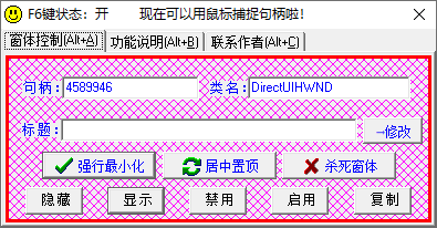 功能说明:按 F6 键可以切换状态,状态为开时,可以移动鼠标获取窗体或子窗体的句柄;状态为关时,将记录最终鼠标所在位置的句柄。有了句柄就可以对窗体控制啦!按 Alt+F2 组合键可以显示/隐藏本窗体。