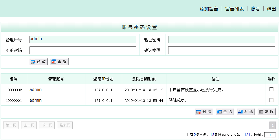 浏览系统:http://域名(或者IP地址)/Index.asp 留言管理登陆账号/密码:admin