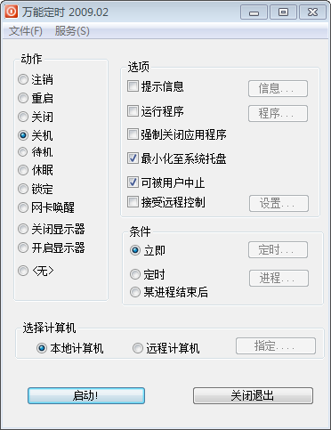本软件主要作用是定时、倒计时关闭计算机,而且持远程控制计算机是家长的好帮手、满足各种对定时关机有需求的用户。您可以设定不同时间,让它自动实现注销、重新启动、关机、切断电源、待机、休眠、锁定、支持关机前提示信息、关机前运行程序、强制结束进程、声音提示等功能。功能支持:1、快速关闭计算机;2、重新启动计算机;3、定时锁定计算机;4、自定义关机-自由设定关机时间;5、某进程结束后关机。