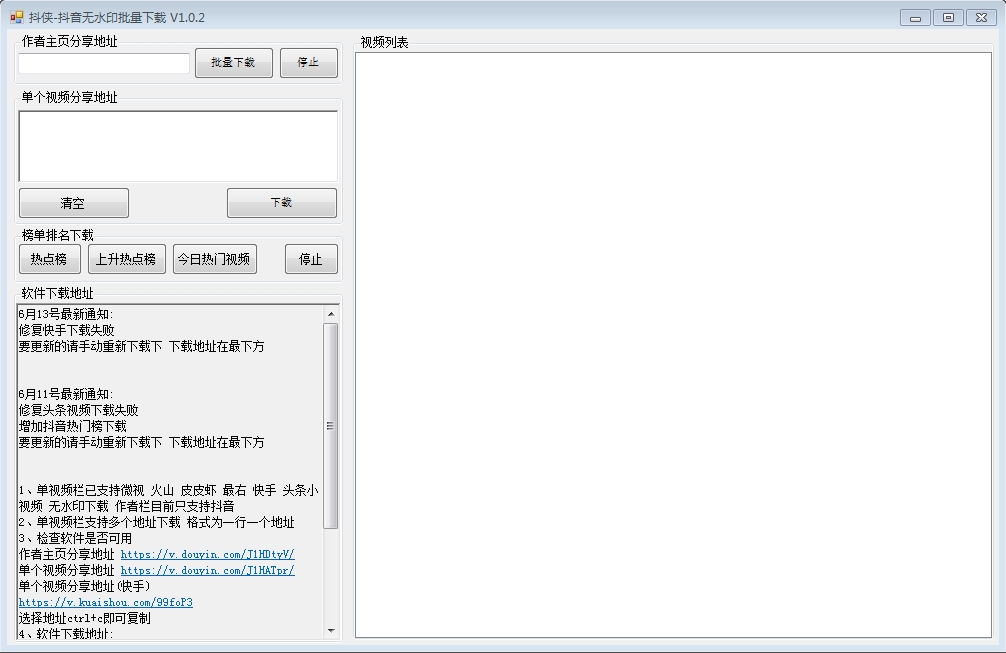 作者栏目前只支持抖音。单视频栏已支持微视、火山、皮皮虾、最右、快手、头条等视频无水印下载。单视频栏支持多个地址下载,格式为一行一个地址。
