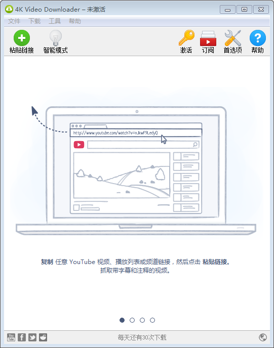 一、首先,前往 https://www.4kvideodownloader.com/ 网站下载这款 YouTube 视频下载软件,然后按照提示将软件安装到你的 PC/Mac 电脑上并运行它,该软件已经过权威工具检测,不携带任何病毒或插件,可放心使用!
