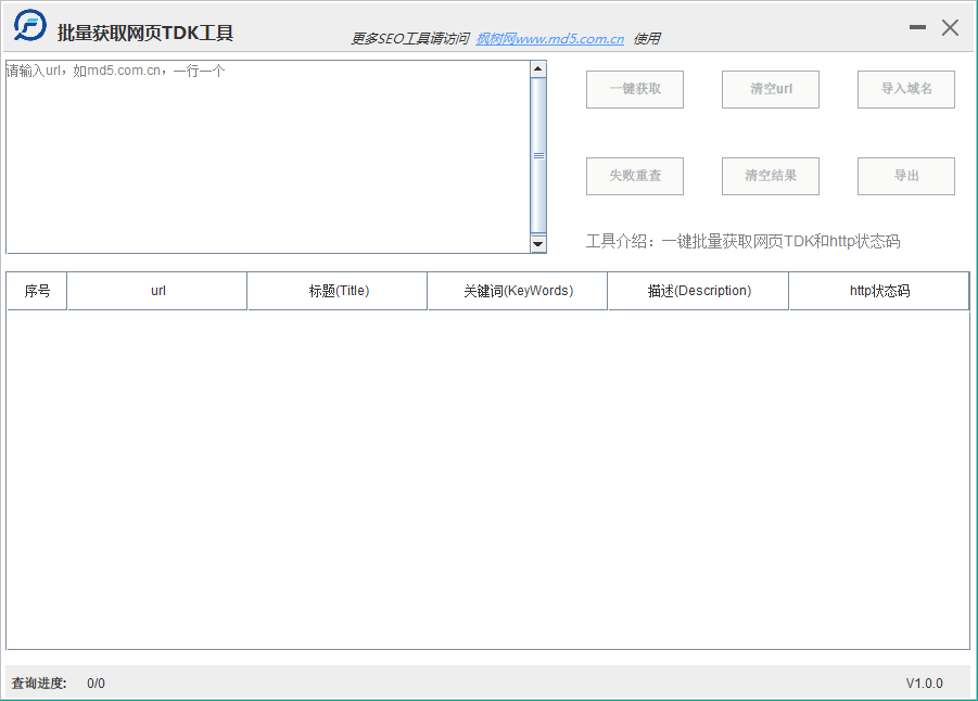 该工具是一款使用极其简单方便的工具,用户无需登录,下载即可一键批量获取网页TDK和http状态码,非常适合站长的seo优化工作。