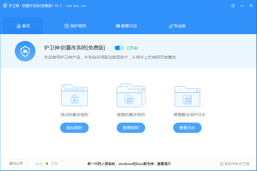 护卫神·防篡改系统,网页防篡改,网站防篡改,服务器防篡改。采用底层驱动技术,对文件、进程、注册表、程序池进行篡改保护,适用于 Windows 系统。Linux 系统请使用防入侵系统。